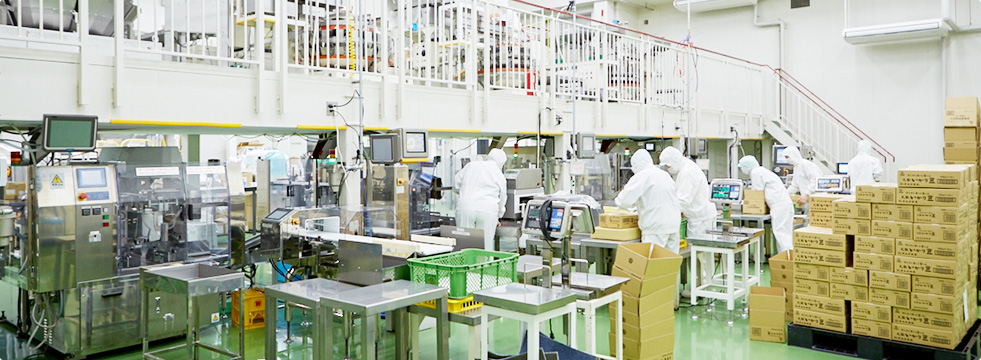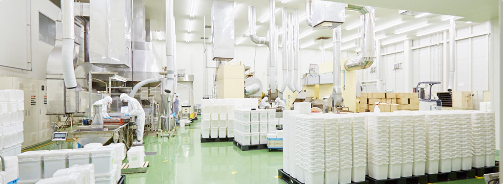 新工場では、(1)製造工程の効率化、(2)安心・安全面での追求、(3)作業環境の改善を念頭に食品工場専門の設計士による設計の下、業界最先端の工場を建設いたしました。
