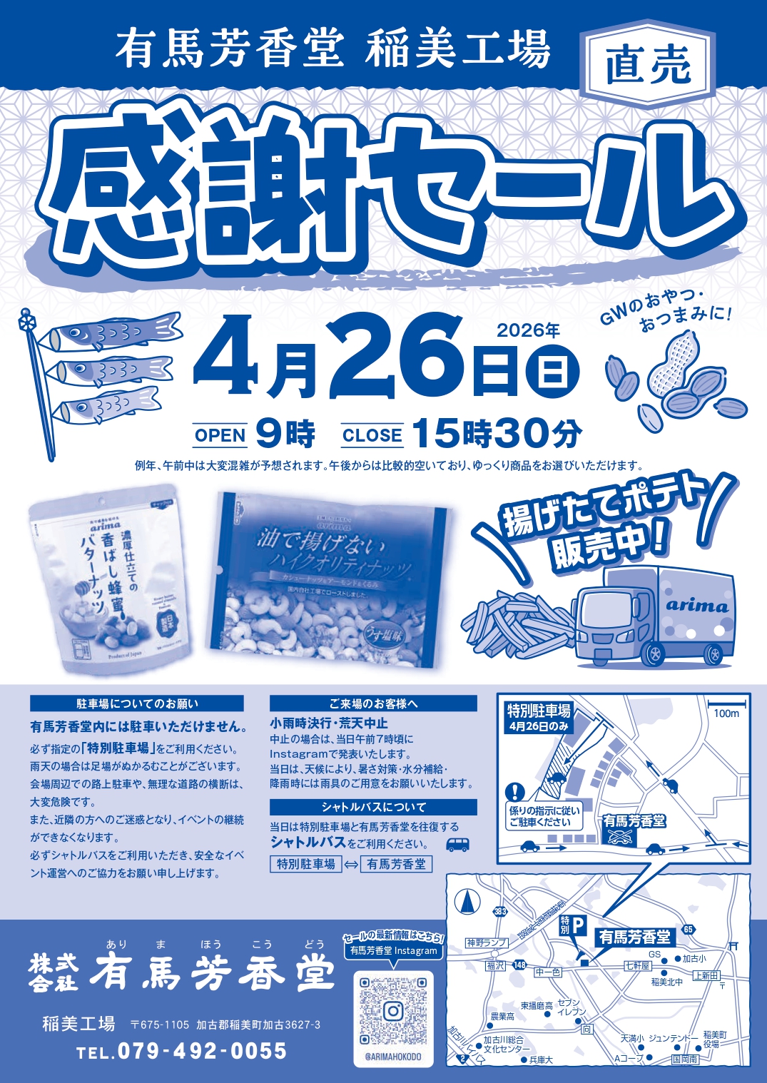 有馬芳香堂自慢のナッツや豆菓子に加えて、感謝セール限定商品も発売予定です。お楽しみに。